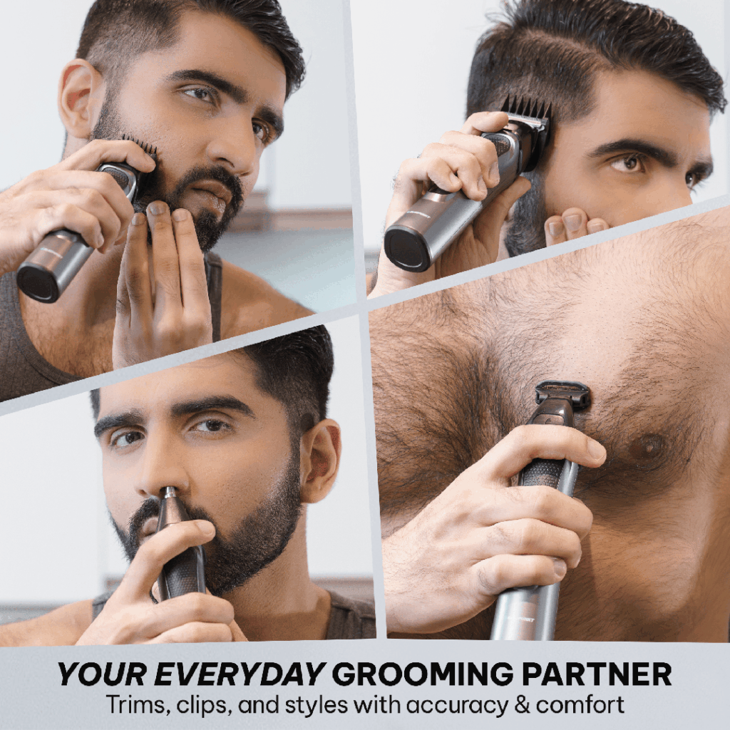 Comprehensive all-in-one men’s grooming kit with precision beard trimmer, nose trimmer, micro shaver, and body groomer attachments to handle beard styling, hair trimming, and body grooming needs at home or travel.