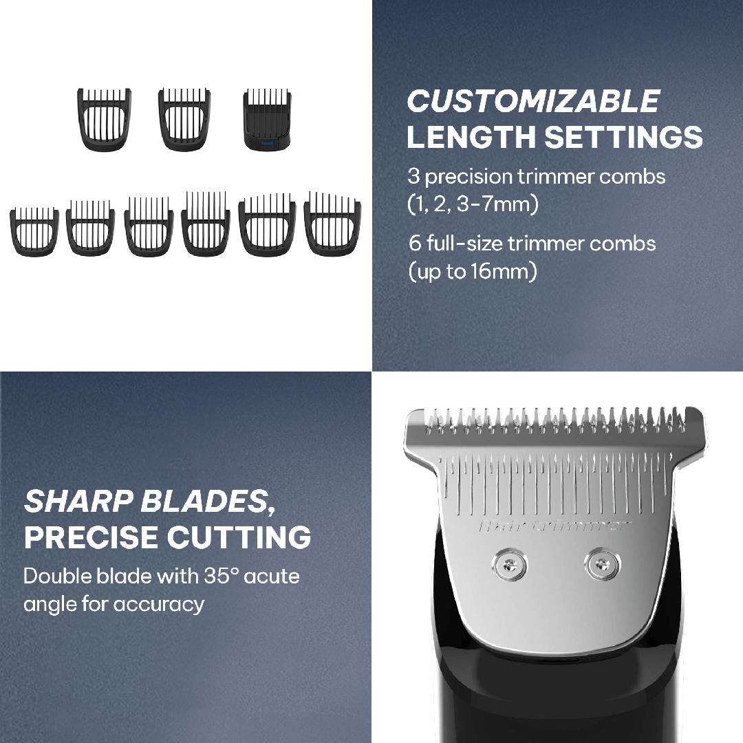 Includes adjustable guide combs (1mm, 2mm, 3–7mm) for detailed beard trimming and 6 combs (4mm–16mm) for full-size trimming, enabling customized haircuts, stubble, or full beard shaping with accuracy.