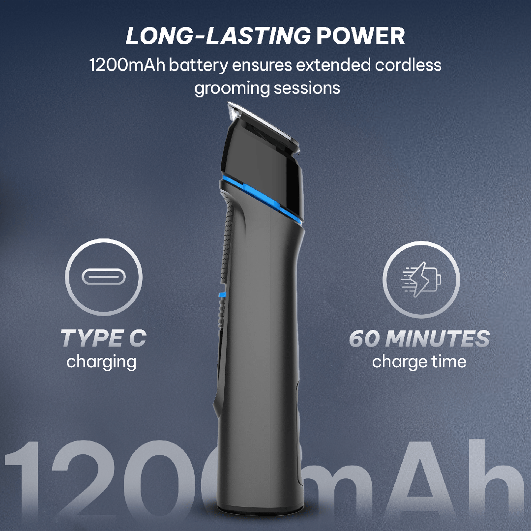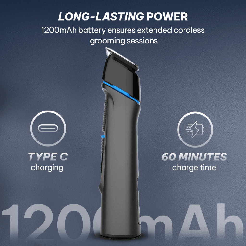 High-capacity 1200mAh lithium battery provides up to 120 minutes of cordless runtime. Charges fully in 60 minutes using USB-C cable (adapter not included), making it ideal as a rechargeable grooming kit for home or travel use.