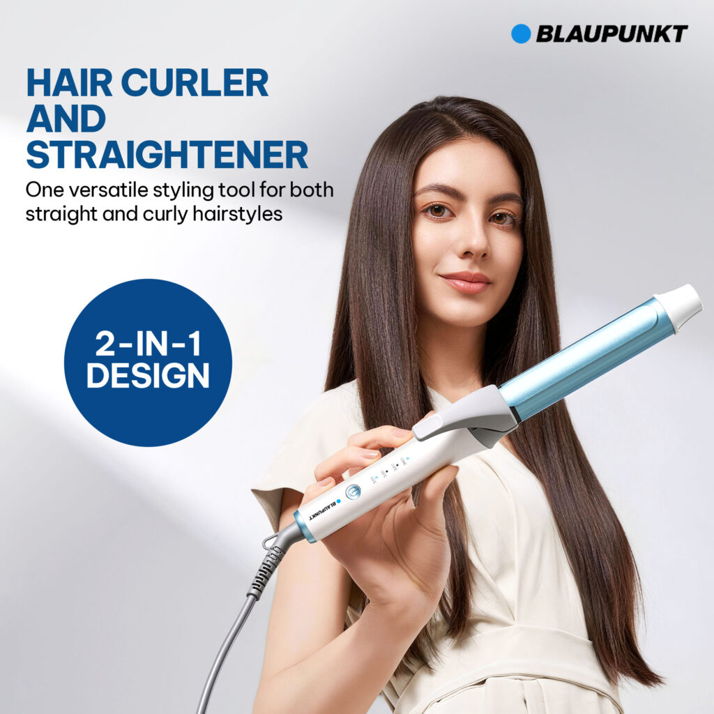 The Blaupunkt Hair Curler and Straightener SCS552 offers flexible styling with a convenient 2-in-1 design. Whether creating smooth straight looks or defined curls, this versatile tool adapts easily to your styling needs, with three adjustable temperature settings and a 28mm barrel, it supports controlled styling while the constant ionic function helps maintain frizz-free, shiny results. Designed for comfort and convenience, it includes a 360° swivel cord and comes with a 2-year warranty for peace of mind.