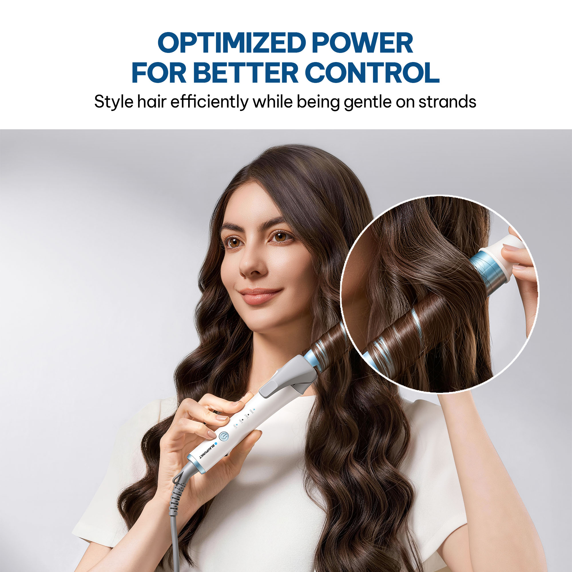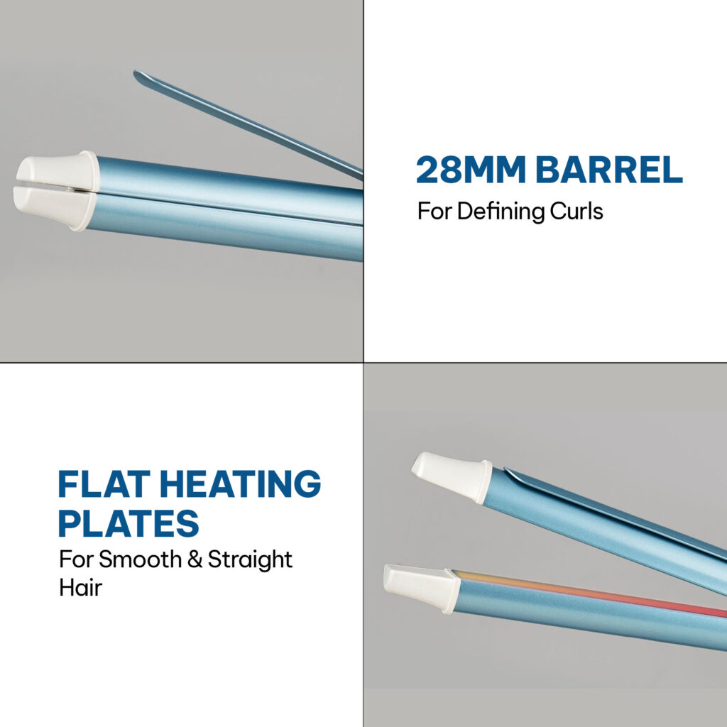 Ideal barrel size for defined curls, while wide flat heating plates support smooth straight styling.