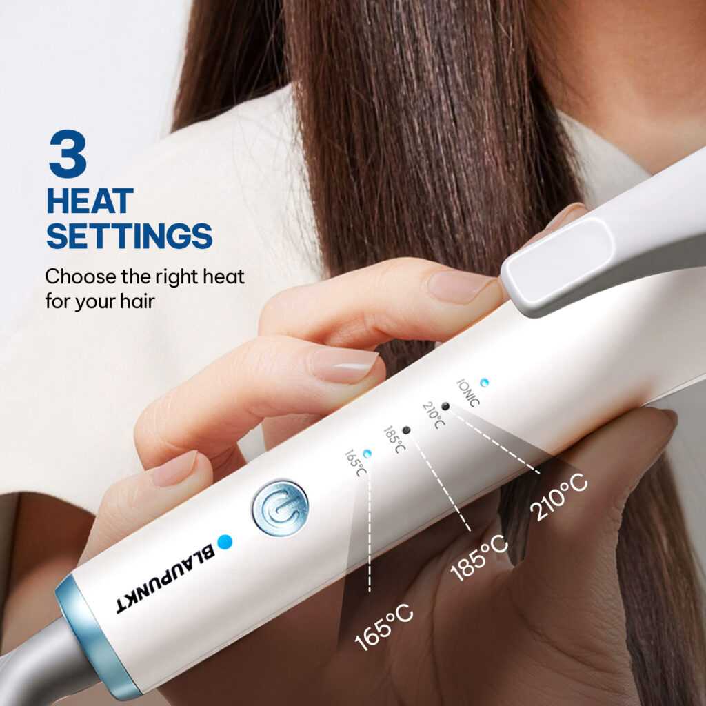 Adjustable heat levels at 165°C, 185°C, and 210°C help select the right temperature for different styling needs.