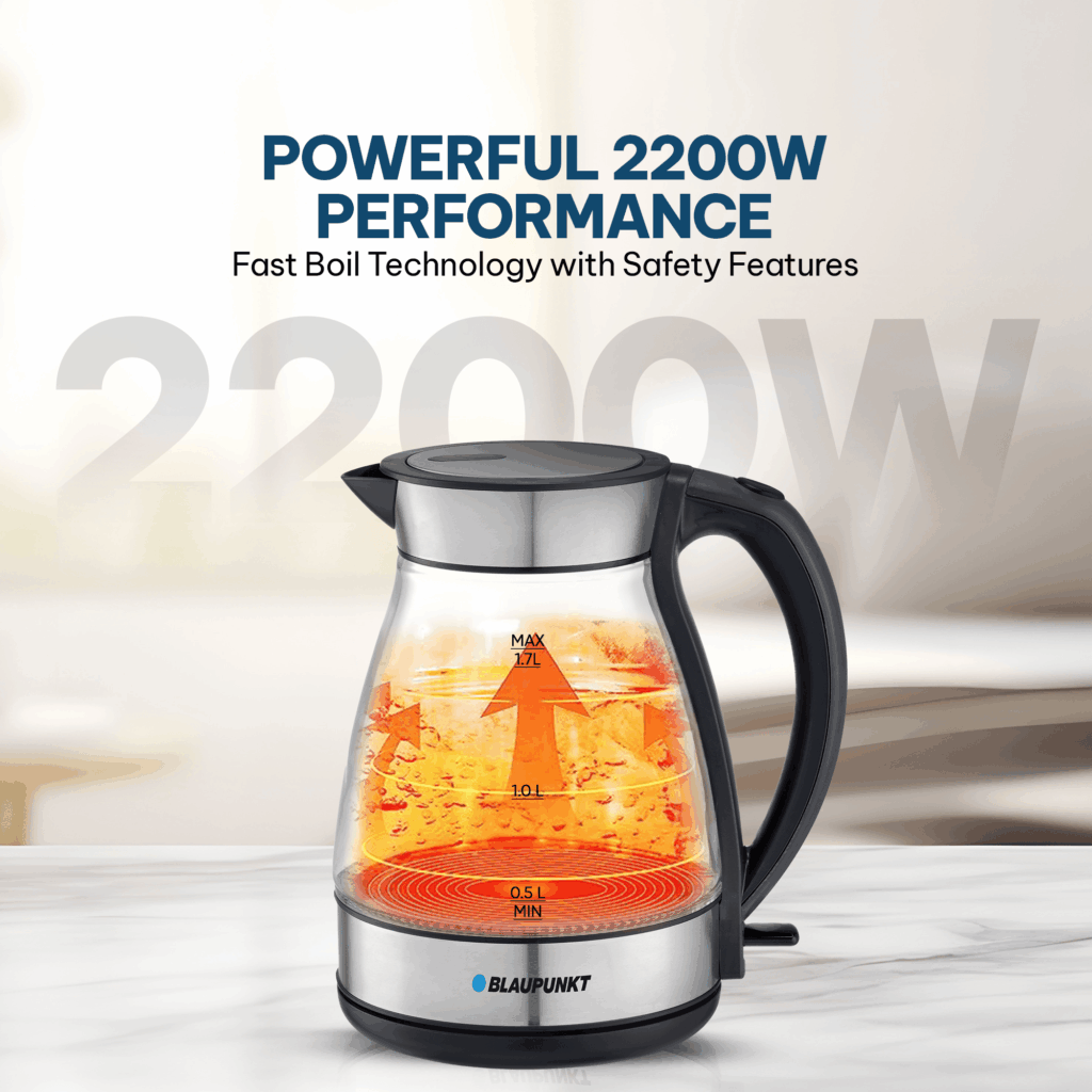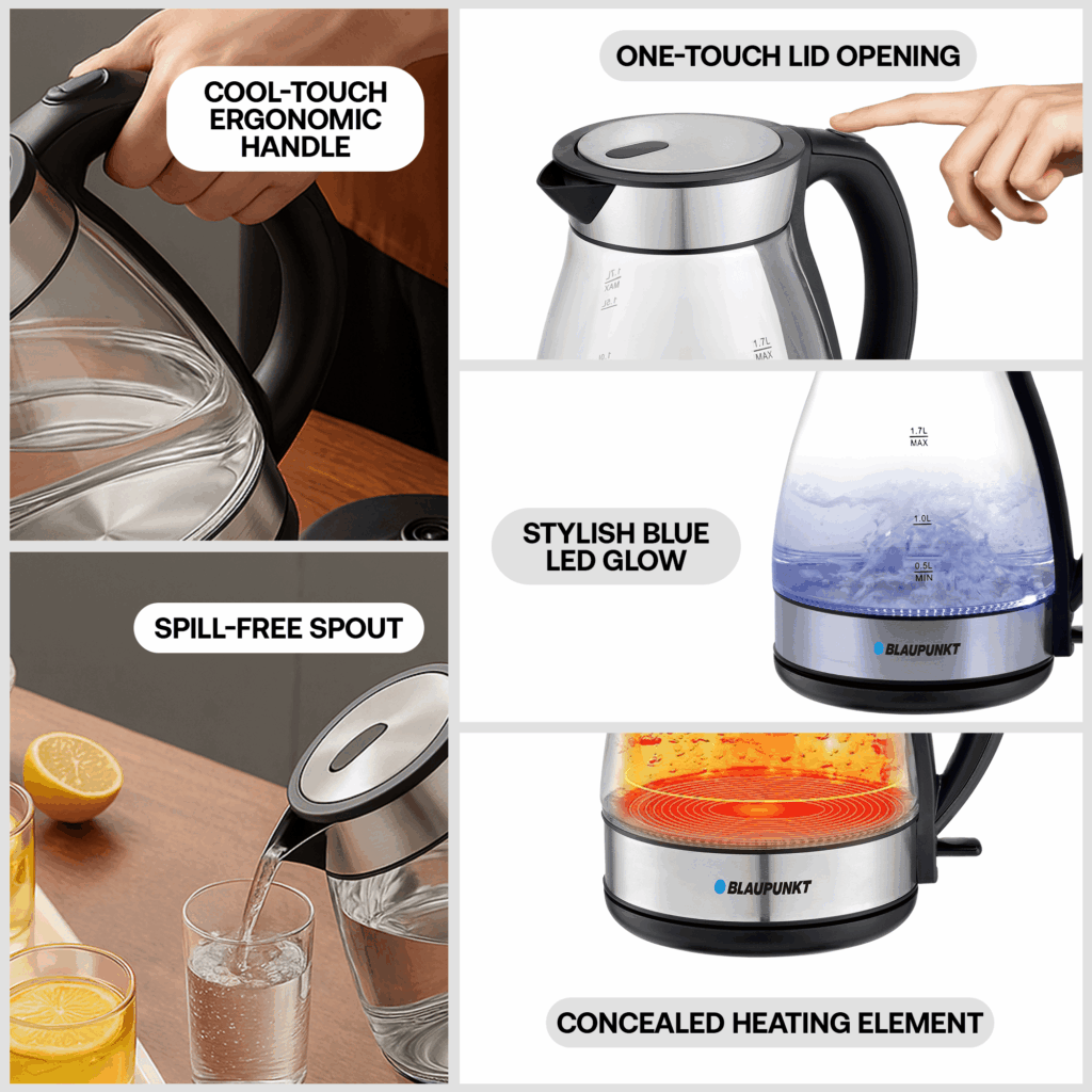 Crafted from premium borosilicate glass, the kettle resists stains, odours, and scaling while adding a sleek look to your countertop. The soft blue LED illumination provides a visual cue during boiling, enhancing safety and style.