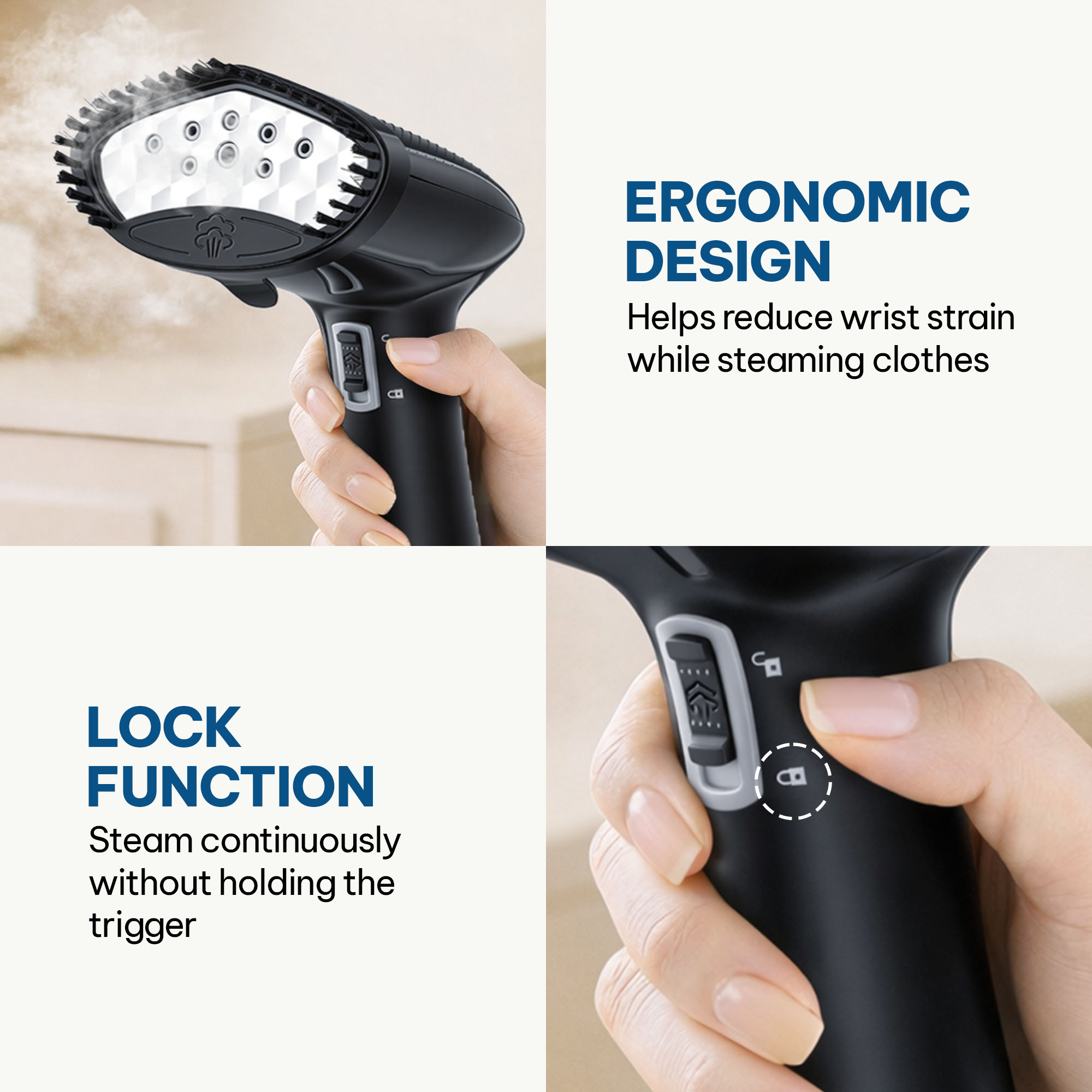 Compact and comfortable to hold, featuring a single switch with lock function for continuous steam without finger fatigue.