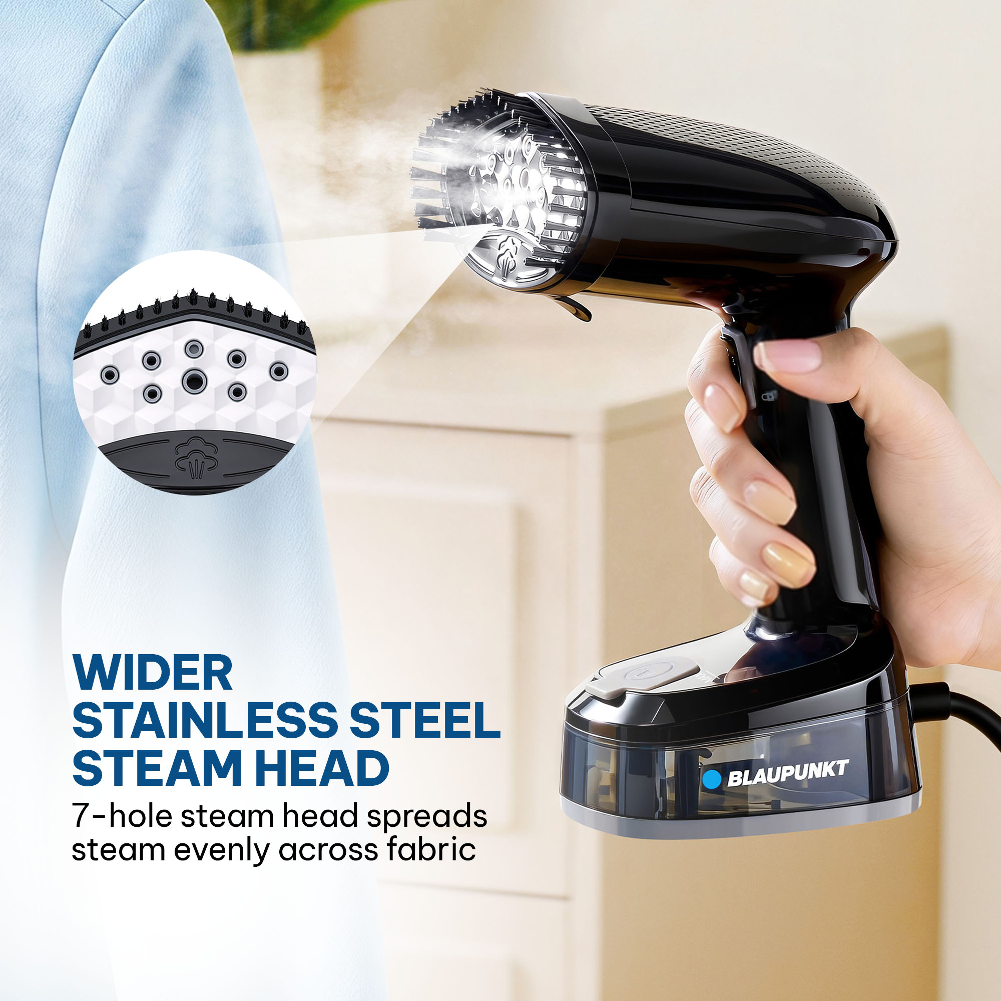 This compact unit is ergonomically designed so that you can use it for extended periods without wrist fatigue. The single switch with lock function can free your trigger finger for continuous steam. The stainless steel steam head with 7 holes ensures efficient distribution of steam. This unit is versatile and can be used for vertical and horizontal tasks.