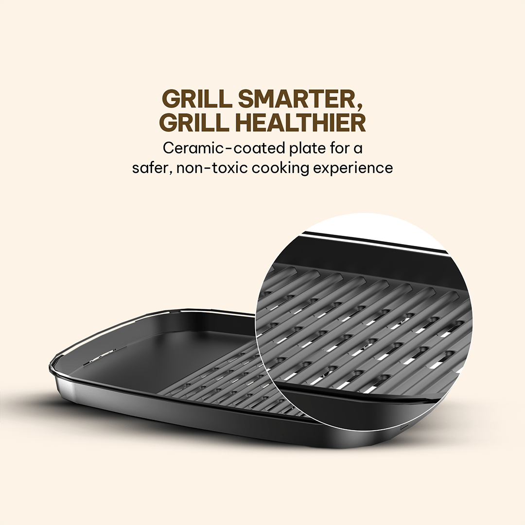 Premium ceramic coating prevents sticking, supports low-oil or oil-free cooking, and allows hassle-free cleaning after preparing multiple grilled recipes.