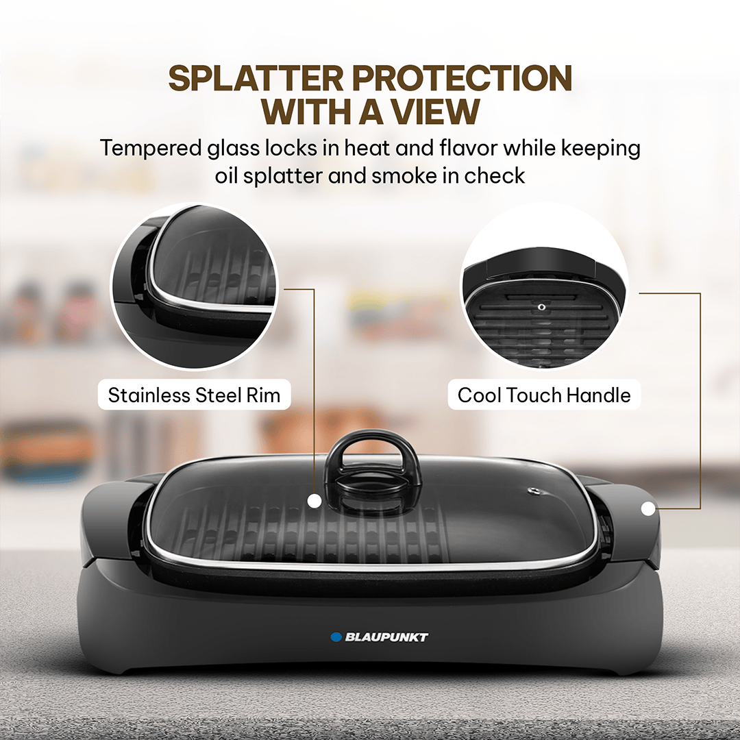 A tempered glass lid with cool-touch handle minimizes smoke and splatter while retaining heat for faster cooking and lets you monitor food without lifting the lid. The adjustable temperature control knob ensures precision for different recipes, and the removable drip tray collects excess oils for easy cleanup.