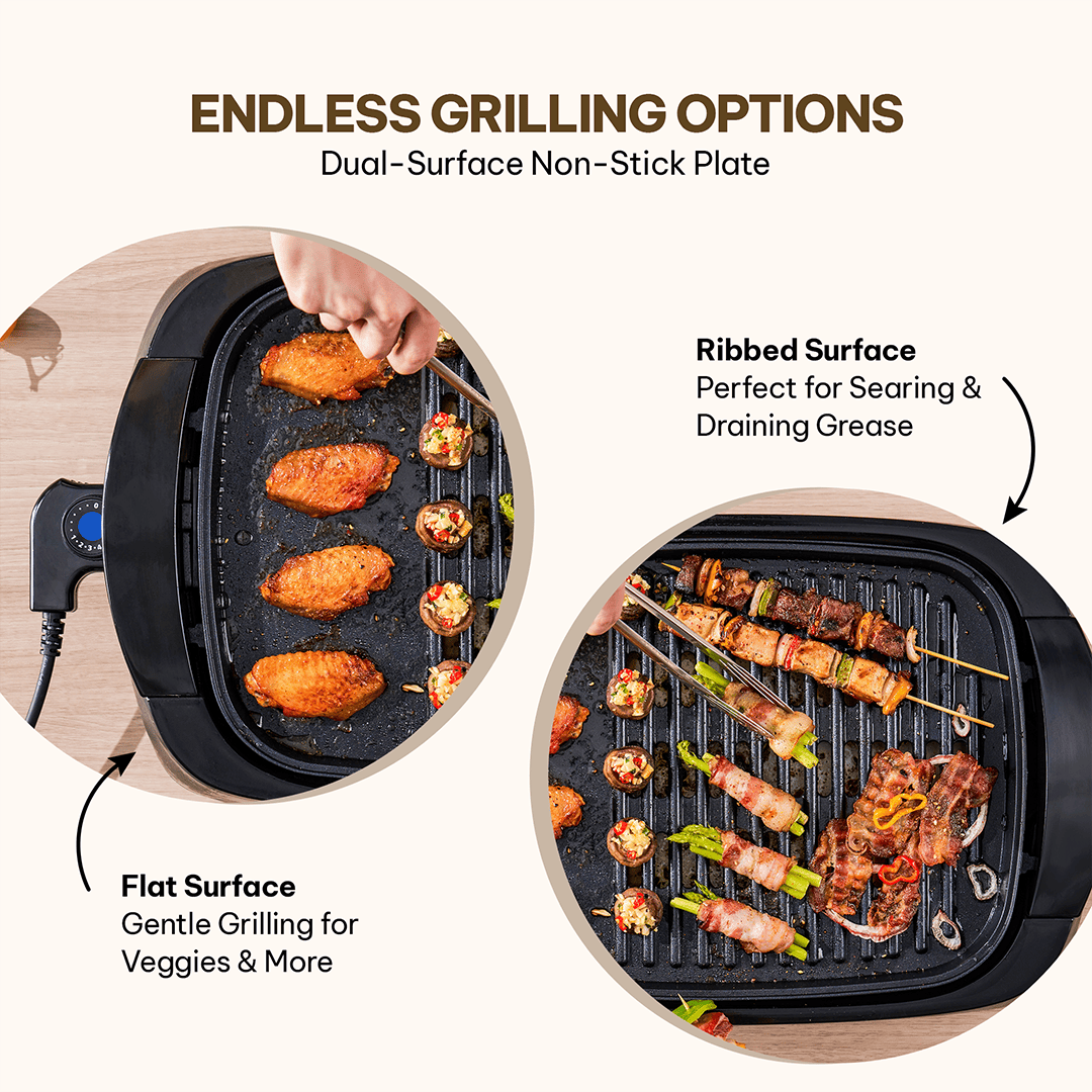 The ceramic coated non-stick grilling plate supports oil-free or low-oil cooking, ensuring healthier meals and easy food release. With its dual cooking surface, the ribbed side is ideal for searing meats and draining excess fat, while the flat side is perfect for eggs, pancakes, and delicate foods — allowing you to prepare multiple items at once.