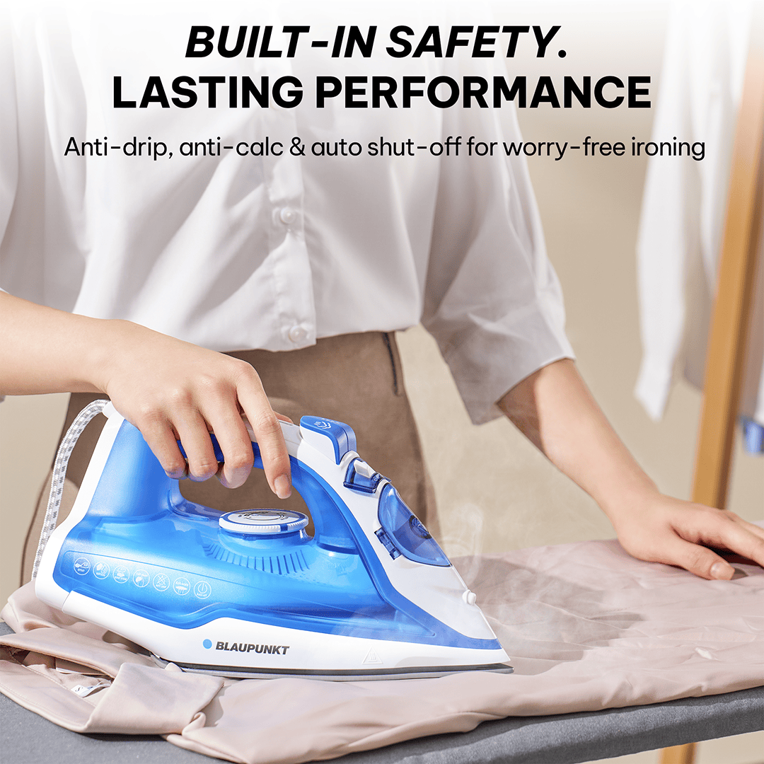 Equipped with auto shut-off for enhanced safety, anti-drip to prevent water stains, and self-clean function to minimize limescale buildup, extending the iron’s lifespan.