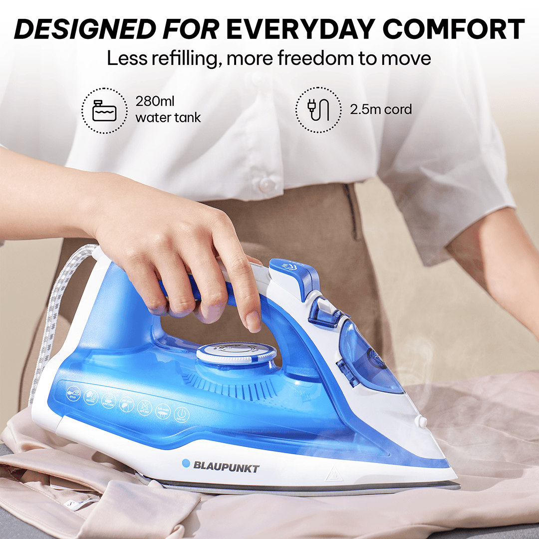 Reduces frequent refills with a spacious water tank and offers flexible movement during ironing with an extended cord length, perfect for large laundry loads.